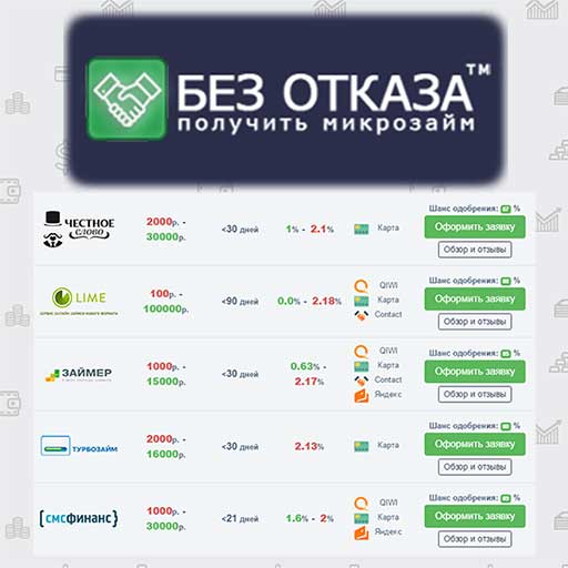Микрофинансовые организации (МФО) - один из самых оперативных и безотказных способов получить срочные онлайн займы. На сайте «Без отказа» собраны самые популярные и надежные ресурсы, которые окажут финансовую помощь, когда это необходимо. Через 20-30 минут после подачи заявки на выдачу микрозайма можно получить нужную сумму на карту, электронные кошельки или наличными. После одобрения займ поступает на указанный счет в срок до 5 минут.